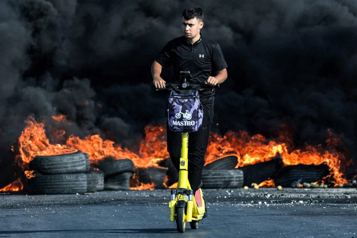 A Palestinian demonstrator rides a scooter past burning tires during clashes with Israeli soldiers in the city of Ramallah in the occupied West Bank on October 8, 2023. (Photo by Jaafar ASHTIYEH / AFP)