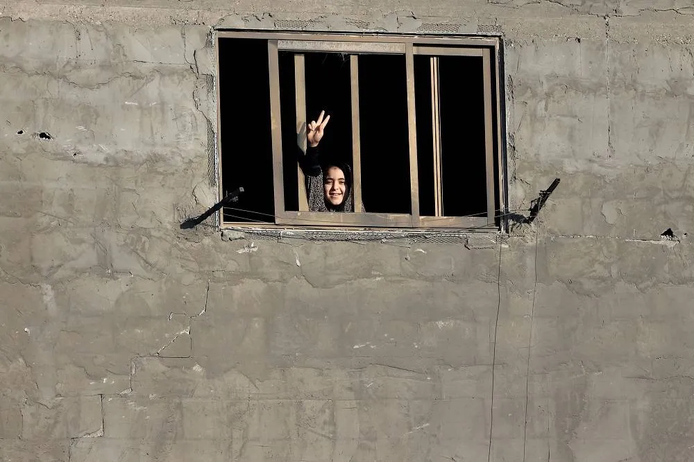 A Palestinian girl flashes the V-sign for victory as she stands at the window of a home in the Nuseirat refugee camp, in the central Gaza Strip on October 30, 2023, amid the ongoing battles between Israel and the Palestinian group Hamas. (AFP)