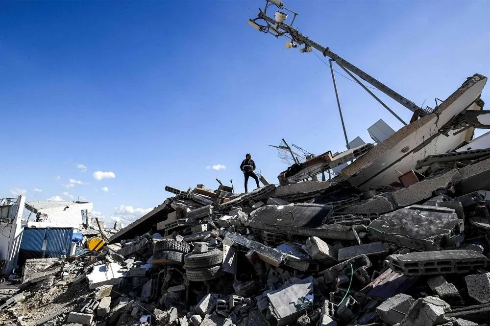 A youth stands by a cellular antenna atop the rubble of a destroyed building in the Maghazi camp for Palestinian refugees, which was severely damaged by Israeli bombardment amid the ongoing conflict in the Gaza Strip between Israel and the Palestinian militant group Hamas, in the central Gaza Strip on February 1, 2024. (AFP)