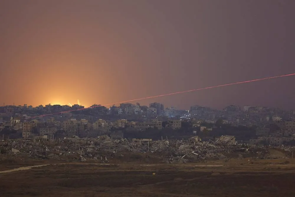 A beam of light is seen in northern Gaza, amid the ongoing conflict between Israel and the Palestinian group Hamas, near the Israel-Gaza border, as seen from Israel, May 28, 2024. (Reuters)