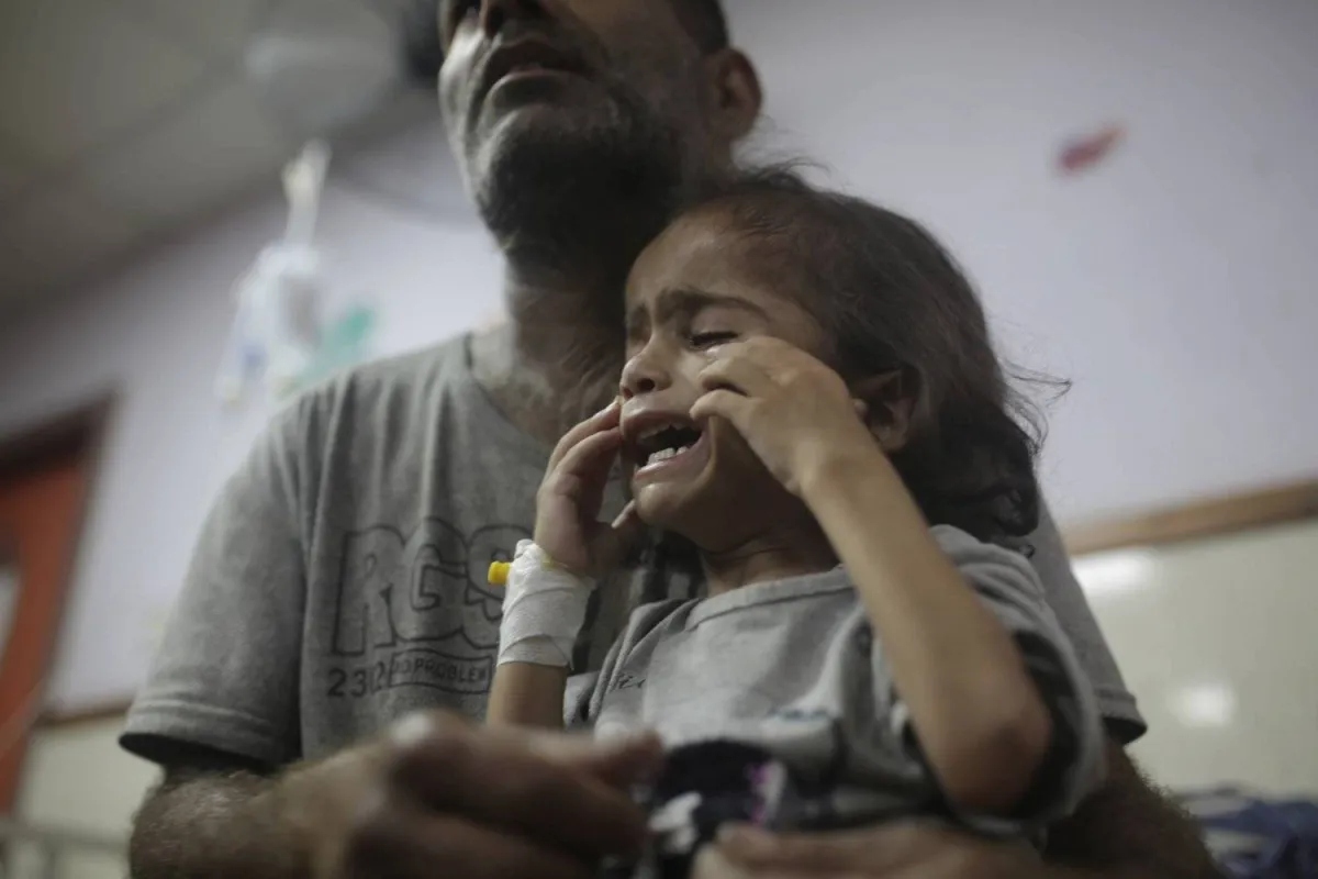 A man holds his daughter, 3, who suffers from diabetes, a weakened immune system, and malnutrition, at Al-Aqsa Martyrs Hospital in Deir al-Balah in the central Gaza Strip, where she is receiving treatment, Saturday, June 1, 2024. (AP Photo/Jehad Alshrafi)