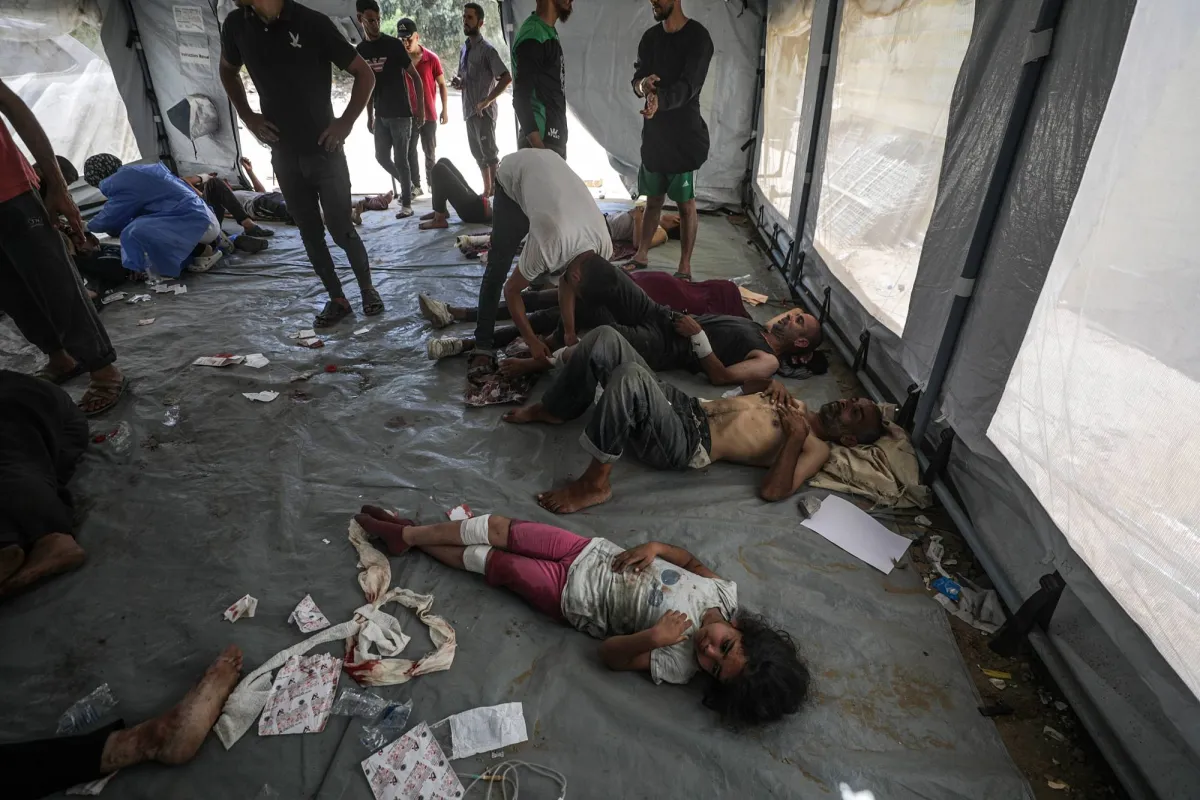 Injured Palestinians at Al Awda hospital during an Israeli military operation in Al Nusairat refugee camp in the central Gaza Strip 08 June 2024. EPA/MOHAMMED SABER