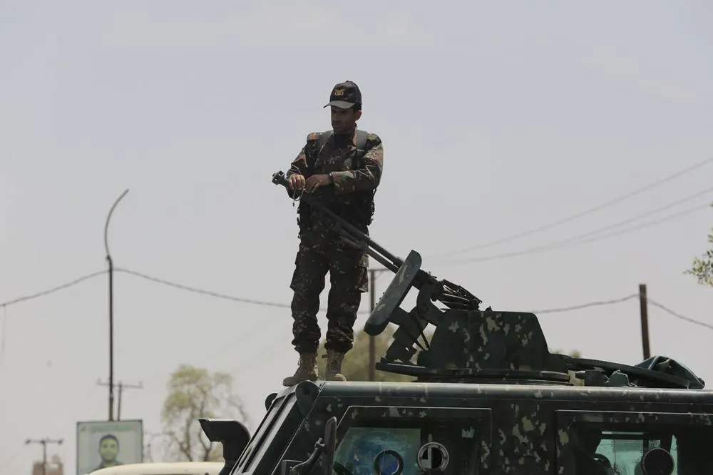 A Houthi member stands on an armored personnel carrier while on patrol in Sanaa, Yemen, 24 June 2024. (EPA)
