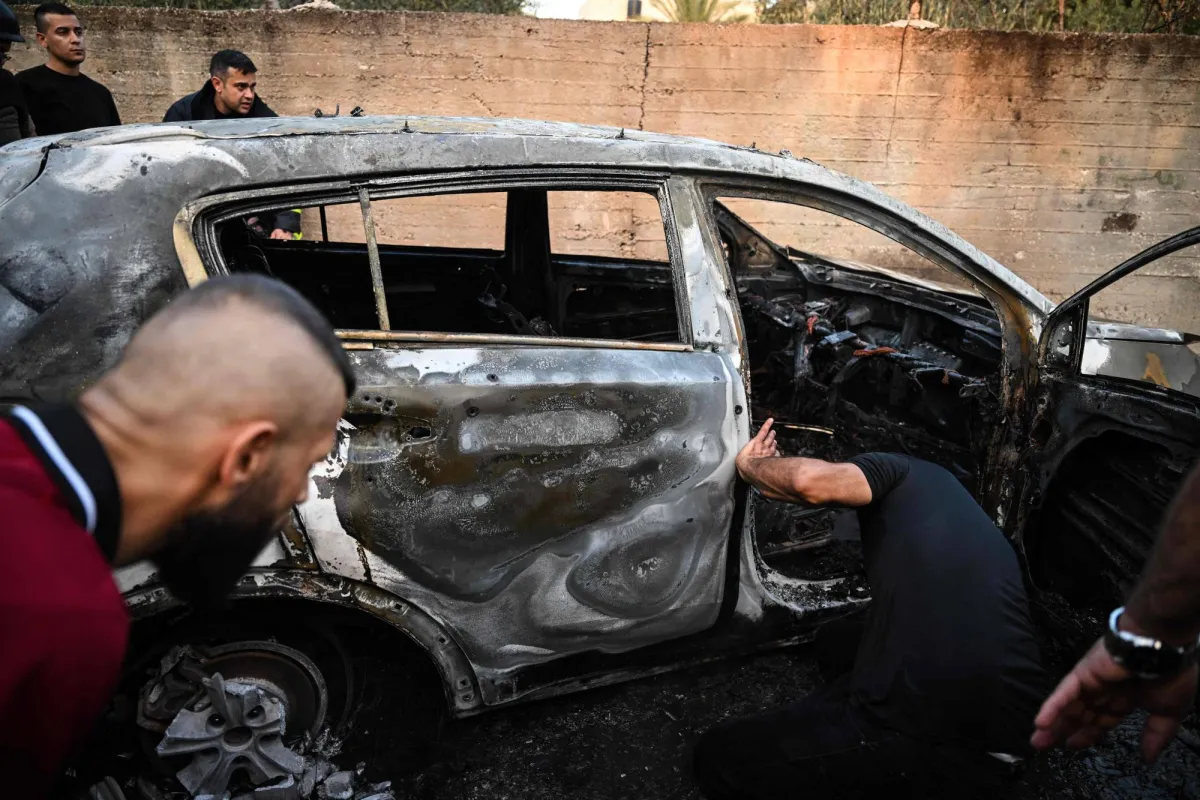 People check a burnt car in the small town of Zababdeh, southeast of Jenin in the occupied West Bank on August 30, 2024, following an Israeli army raid. (Photo by RONALDO SCHEMIDT / AFP)