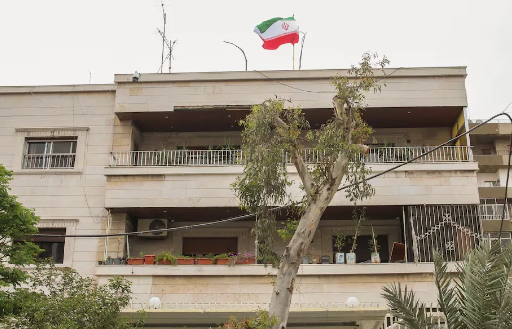 Iranian flag flutters on new Iranian consulate building after Iran's consulate in Damascus was targeted in a suspected Israeli attack on Monday April 1, in Damascus, Syria April 8, 2024. REUTERS/Firas Makdesi/File Photo