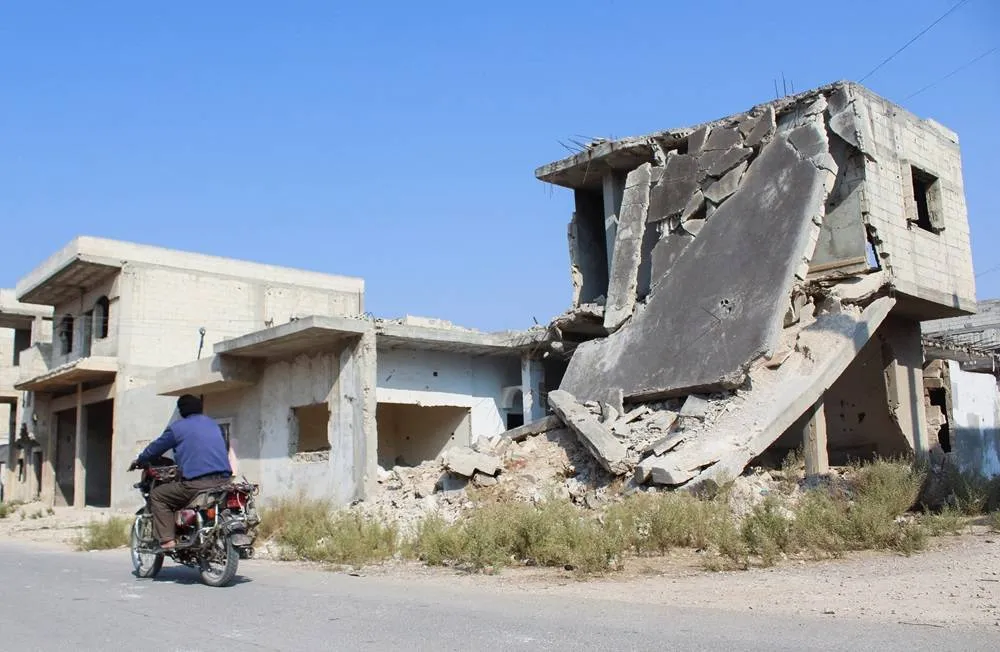 A man rides a motorbike past a damaged building in Homs, Syria November 7, 2024. (Reuters)