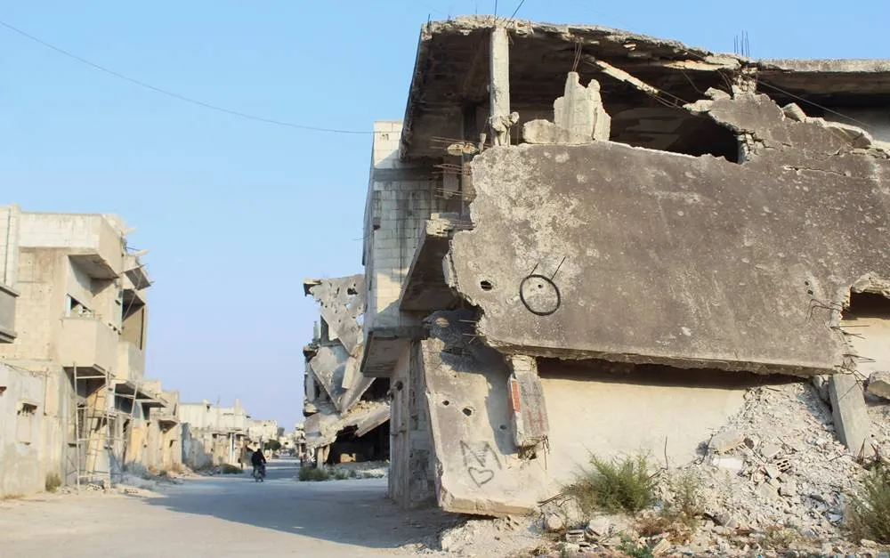 A man rides a motorbike past damaged buildings in Homs, Syria November 7, 2024. (Reuters)