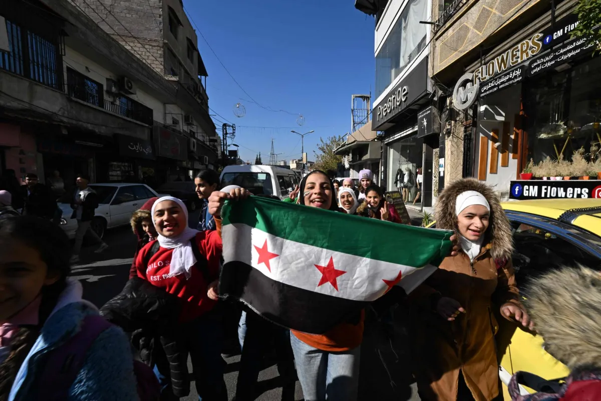 Syrian schoolchildren wave the independence-era flag as they walk down a street in the capital Damascus' Dweilaa neighbourhood on December 15, 2024. (Photo by LOUAI BESHARA / AFP)