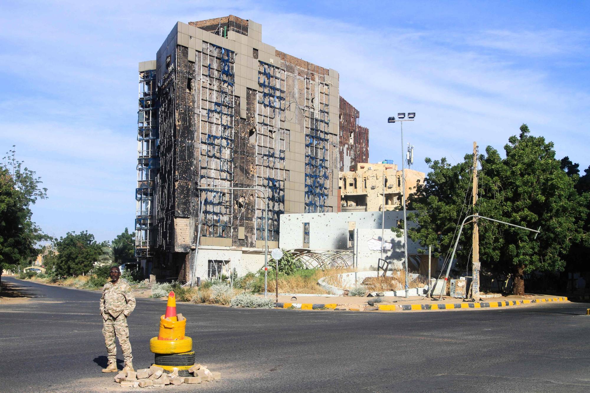 A member of security stands in front of a destroyed high-rise building, as efforts to restore the city's infrastructure resumes after nearly three years of devastation caused by war, in the Sudanese capital Khartoum on January 17, 2025. (AFP)