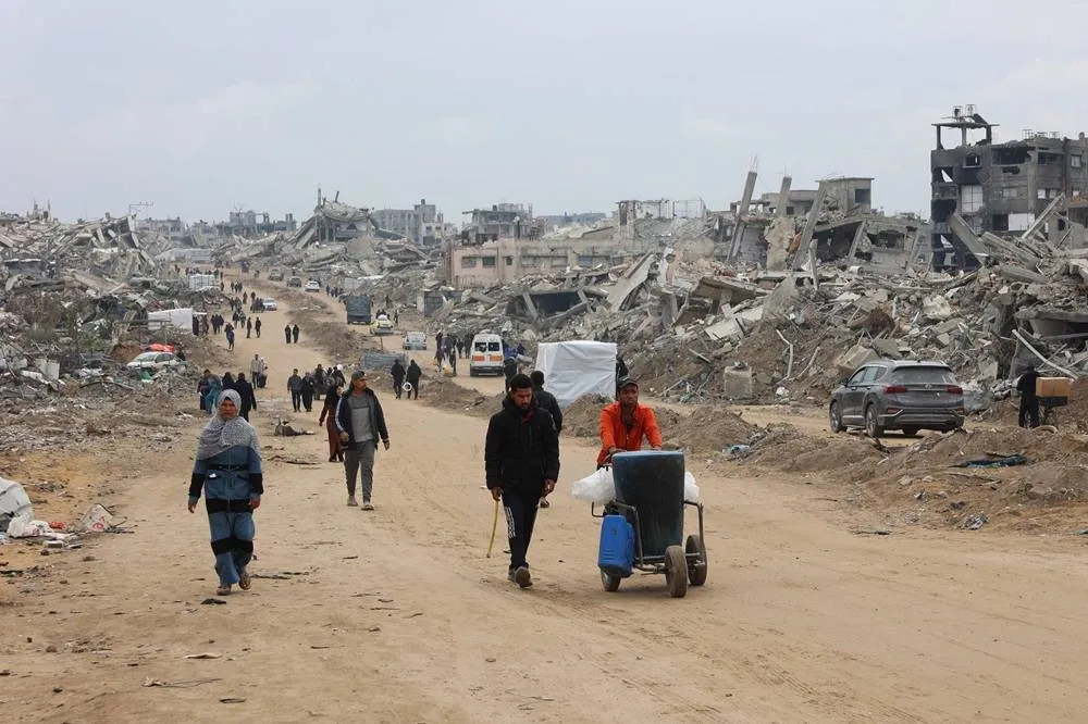 Palestinians walk past collapsed buildings along Saftawi street in Jabalia in the northern Gaza Strip on February 5, 2025 during a ceasefire deal in the war between Israel and Hamas. (AFP)