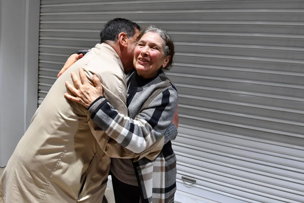 Prominent Tunisian human rights activist Sihem Ben Sedrine is surrounded by her lawyer Ayachi Hamami, upon her release from jail in Manouba near Tunis on February 19, 2025. (Photo by FETHI BELAID / AFP)