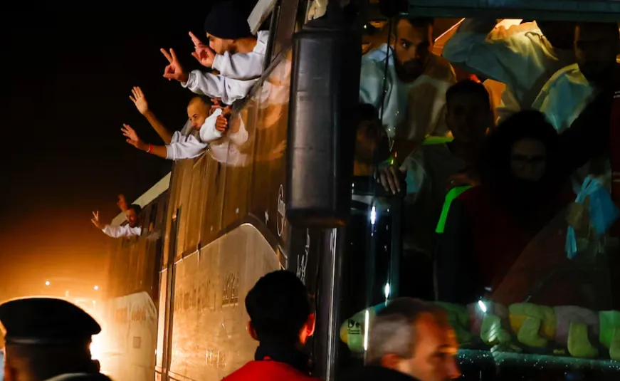 Freed Palestinian prisoners gesture out of the windows as they arrive in a bus after being released from an Israeli jail as part of a ceasefire and a hostages-prisoners swap deal between Hamas and Israel, in Khan Younis in the southern Gaza Strip, February 27, 2025. REUTERS/Hatem Khaled
