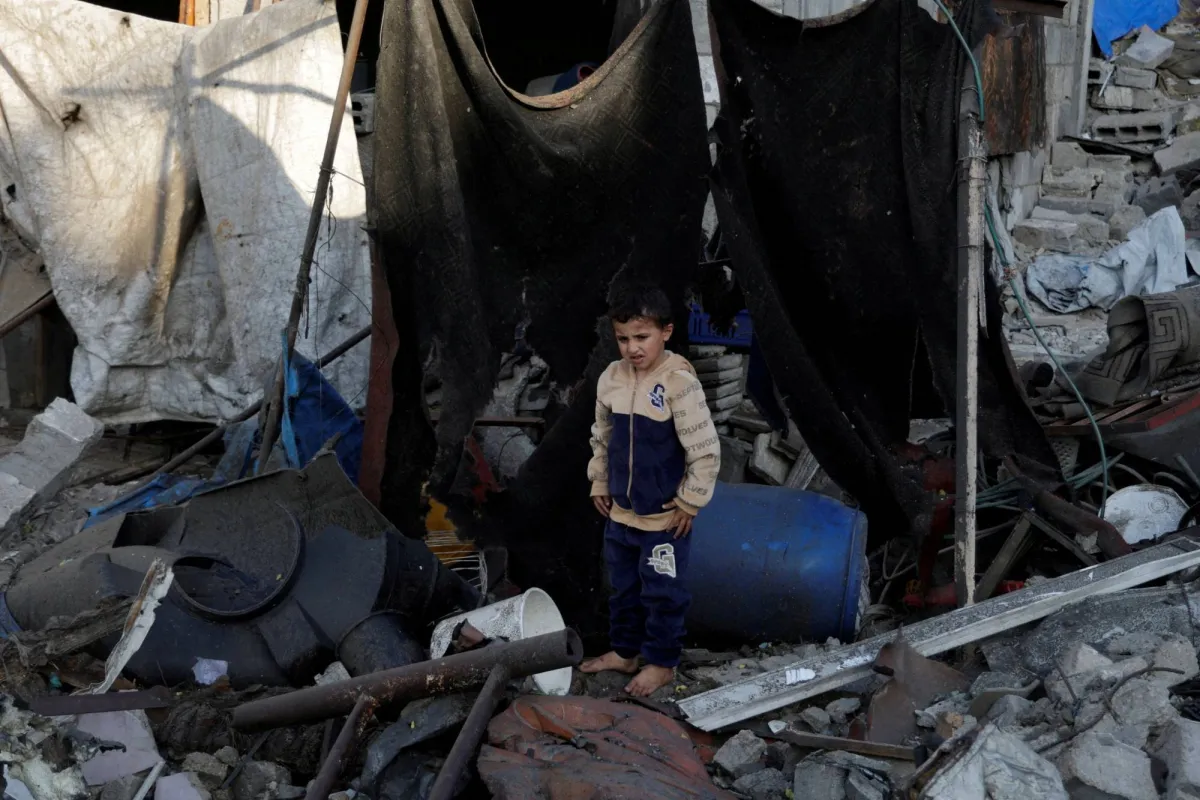 A Palestinian child stands at the site of an Israeli strike on a house, in Khan Younis in the southern Gaza Strip April 19, 2025. REUTERS/Hatem Khaled