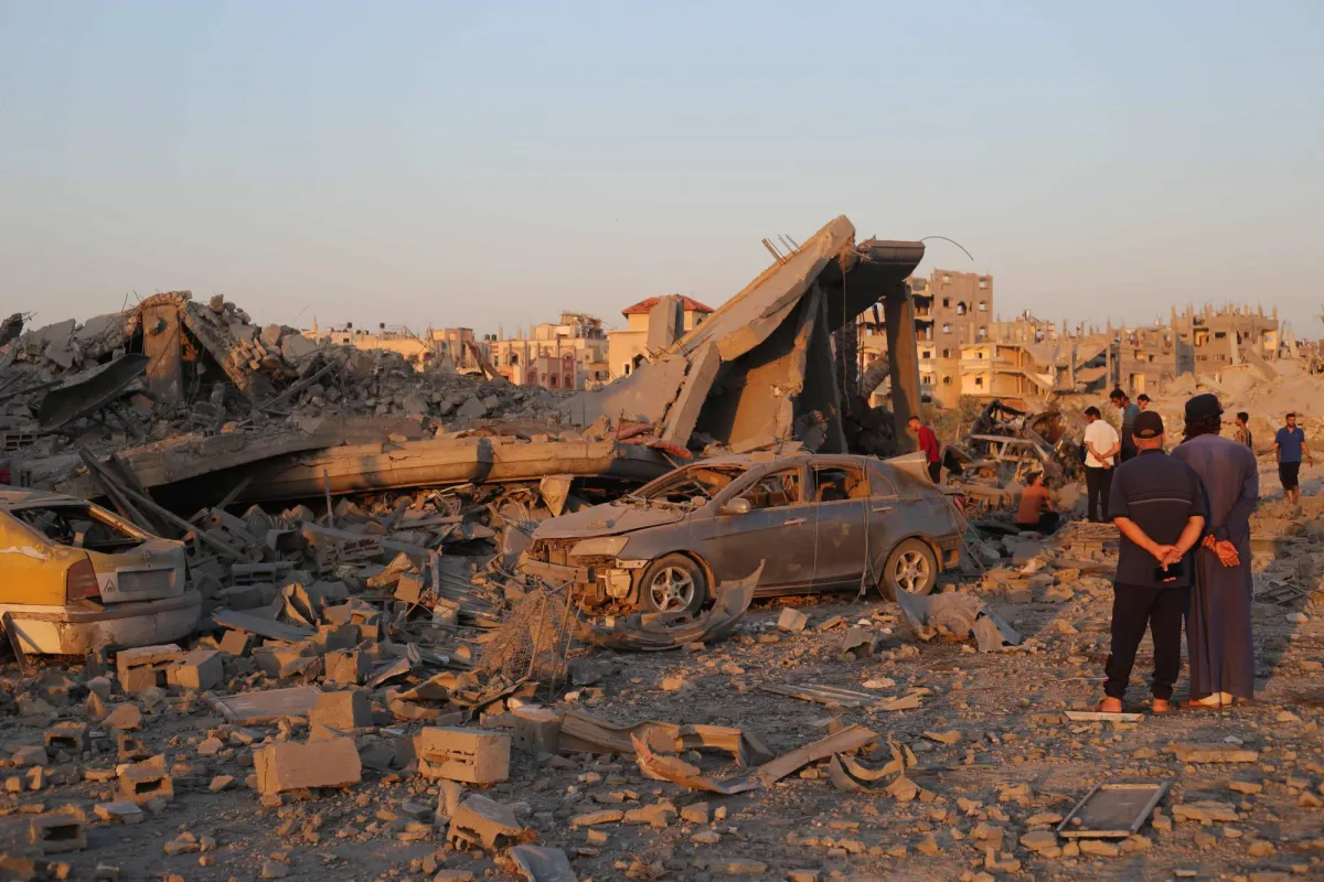 Two Palestinians men survey the rubble and destroyed vehicles in the Al-Bureij camp in the central Gaza Strip after a house was targeted by an Israeli strike, on June 27, 2025, amid the ongoing conflict between Israel and the Palestinian Hamas group. (AFP)