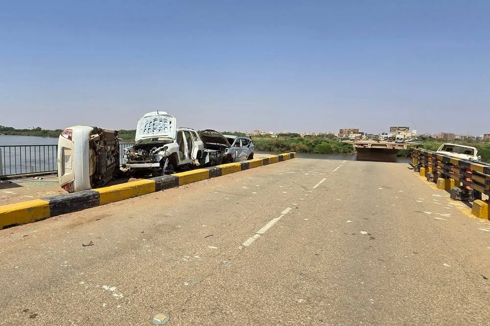 The wreckage of cars lie on the remains of the Shambat Bridge, which connects Omdurman and Bahri, on June 24, 2025 in the Sudanese capital region. (AFP)