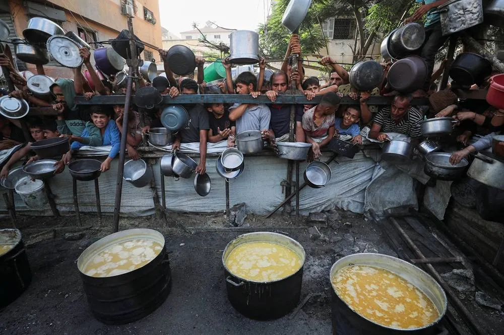 Palestinians wait to receive food from a charity kitchen, amid a hunger crisis, in Gaza City, July 14, 2025. (Reuters)
