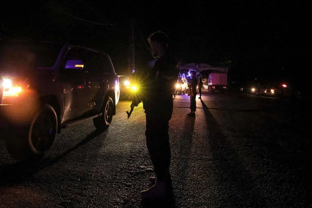 Syrian security forces stand by as a United Nations convoy evacuating families from Sweida moves through the buffer zone in Busra al-Harir in Syria's southern Daraa province on July 22, 2025. (AFP)