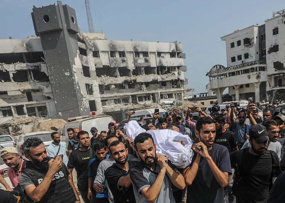 Officials at Shifa Hospital said those killed while sheltering outside Gaza City’s largest hospital complex also included Al Jazeera correspondent Mohamed Qreiqeh, plus four other journalists and two other people. Five of the six slain journalists were Al Jazeera staffers. The strike damaged the entrance to the complex’s emergency building.