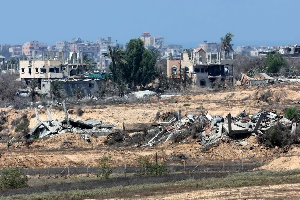 This picture taken from a position on the Israeli border with the Gaza Strip shows destroyed buildings in the embattled territory on August 27, 2025, amid the ongoing war between Israel and the Palestinian group Hamas. (AFP)