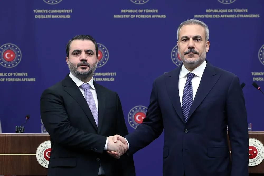 Turkish Foreign Minister Minister Hakan Fidan (R) shakes hands with Syrian Foreign Minister Minister Asaad al-Shaibani during a joint press conference after their meeting in Ankara, Türkiye, 08 October 2025. (EPA)