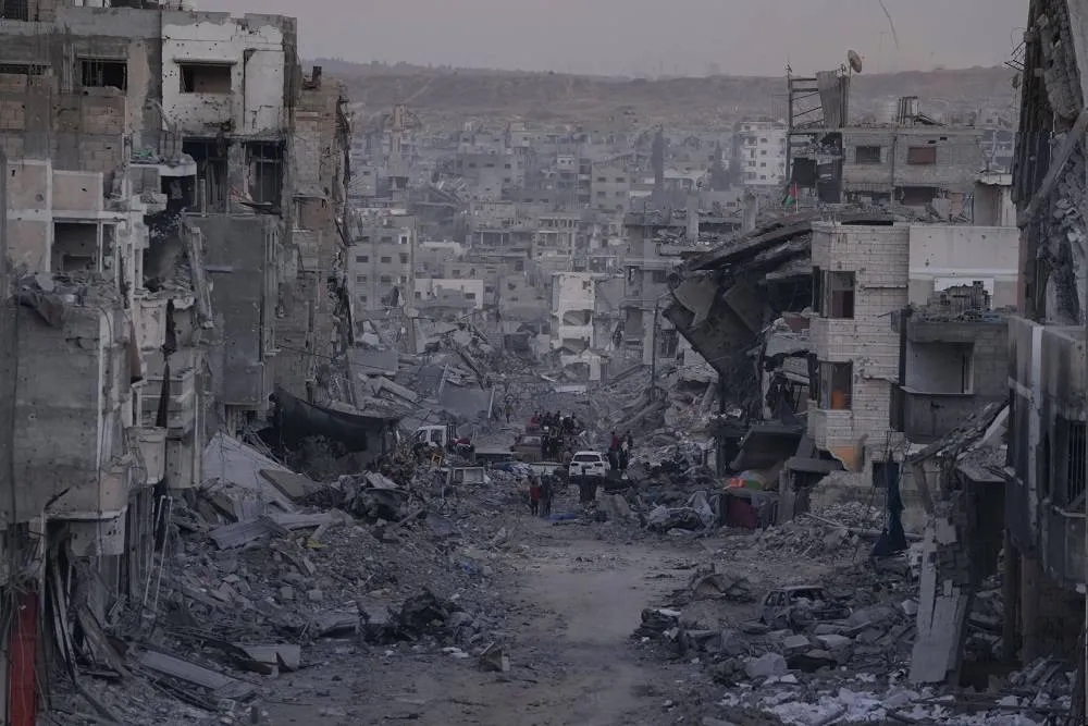 Palestinians walk among destroyed buildings in Gaza City, Sunday, Oct. 12, 2025, after Israel and Hamas agreed to a pause in their war and the release of the remaining hostages. (AP)