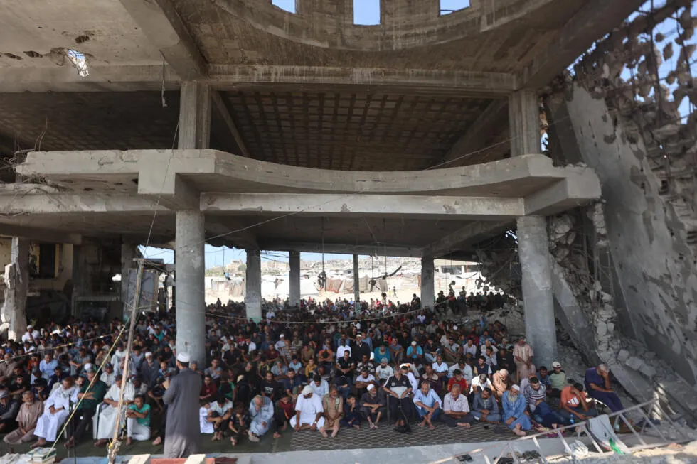 Others bowed near rows of tents housing thousands of displaced Palestinians across Gaza, in living conditions that remain difficult.