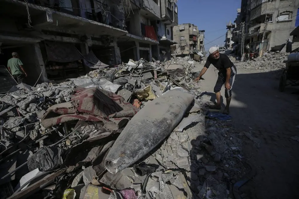 An Israeli missile lays on the rubble in the middle of a street next to destroyed houses in Gaza City, Gaza Strip, 30 October 2025, amid a ceasefire between Israel and Hamas. (EPA)
