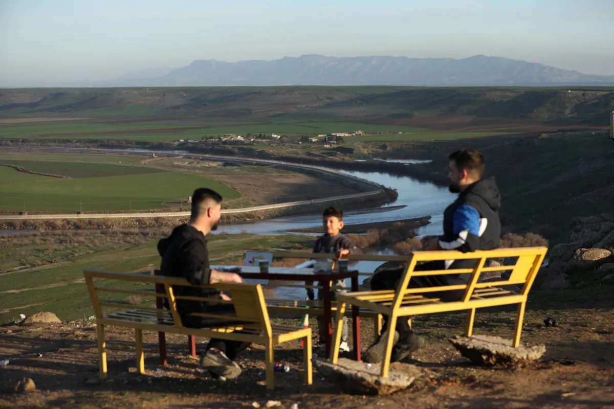 People sit outdoors surrounded by nature, with the Tigris river flowing in the background, following a long atmospheric depression, near the Syrian-Turkish border in Derik, Syria, February 16, 2026 REUTERS/Orhan Qereman