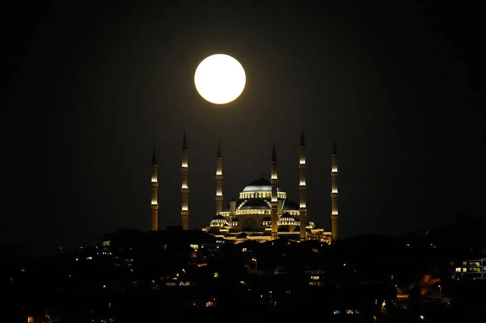 A full moon rises behind Camlica mosque in Istanbul, Türkiye, Monday, July 3, 2023. (AP)