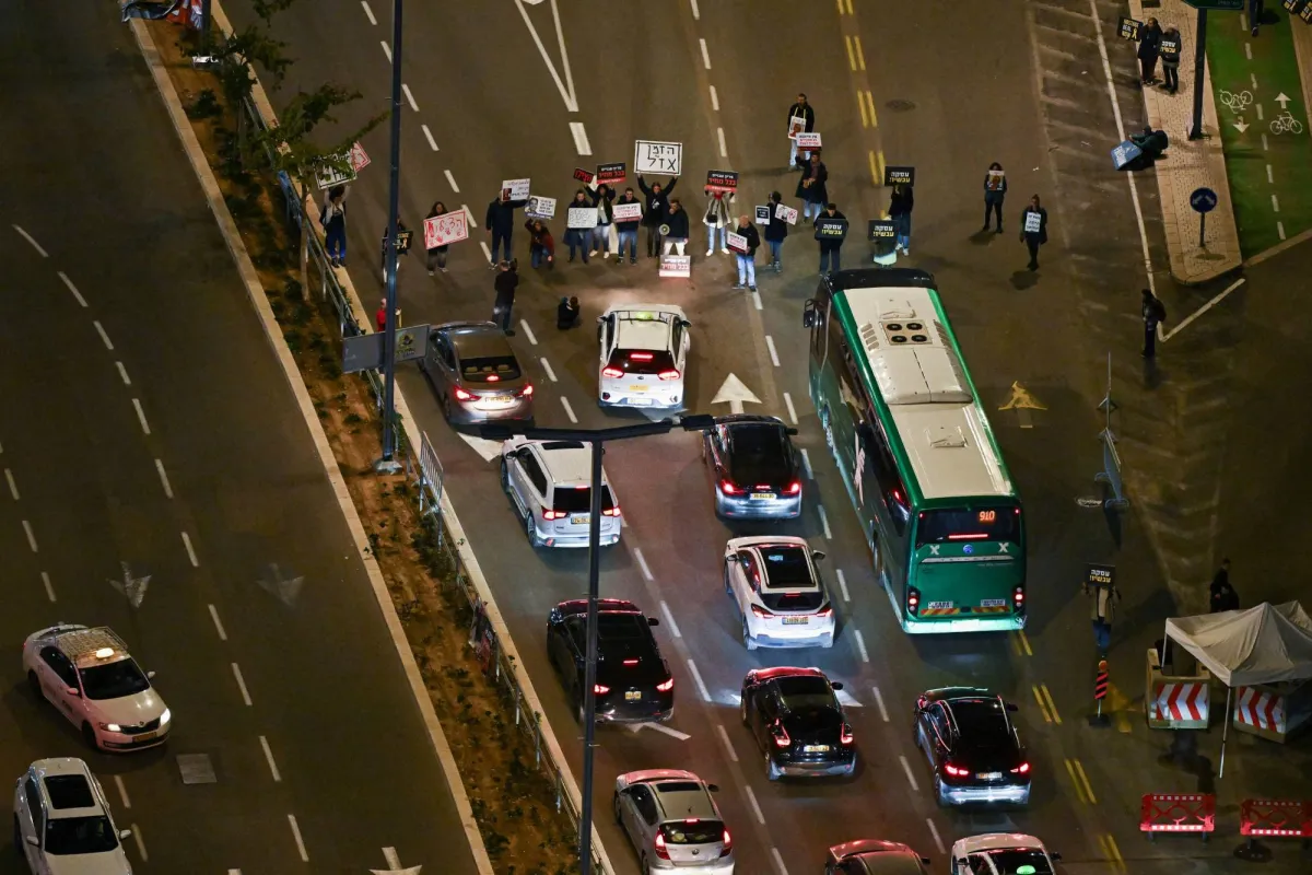 Demonstrators hold signs while blocking traffic as they attend a rally calling for the release of hostages kidnapped in the deadly October 7 attack on Israel by Hamas from Gaza, in Tel Aviv, Israel, February 19, 2024. REUTERS/Dylan Martinez