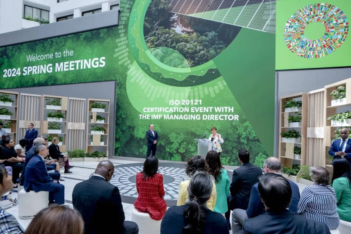 IMF Managing Director Kristalina Georgieva (C-R) delivers remarks after accepting the ISO 20121 certificate from BSI Group Commercial Director Tim Wren (C-L) during a ceremony as part of the 2024 Spring Meetings of the International Monetary Fund (IMF) and the World Bank Group (WBG) in Washington, DC, USA, 15 April 2024. EPA/SHAWN THEW