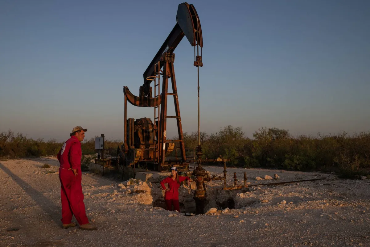 Hawk Dunlap, an oil well control specialist, and Sarah Stogner, an oil and gas lawyer, survey an excavated pumpjack with a leaking surface casing in Ward County, Texas, US, August 6, 2024. REUTERS/Adrees Latif