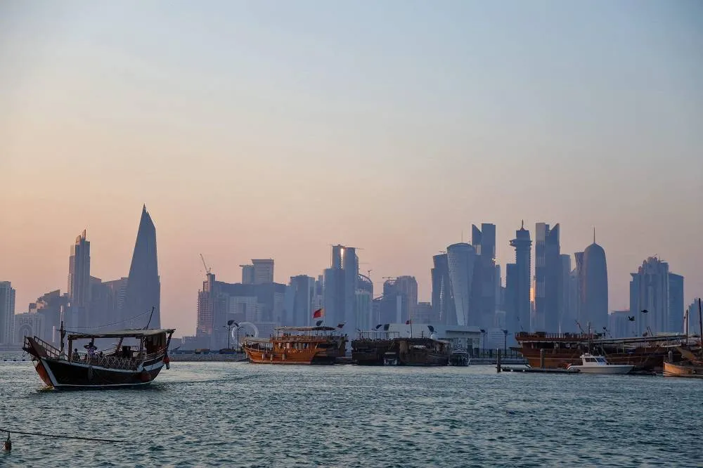 This picture taken from Doha's seaside promenade shows traditional Qatari Dhow boats with the Qatari capital's skyline seen in the background on August 16, 2024. (AFP)