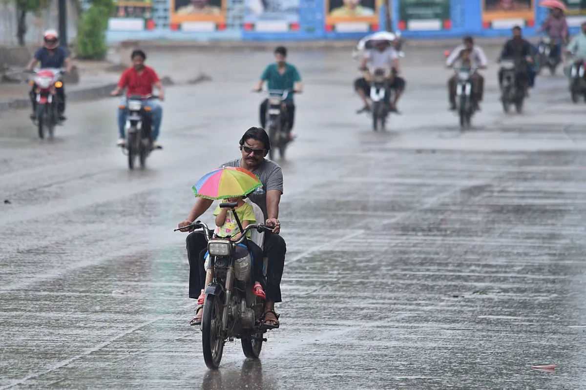 People make their way on motorbikes during heavy downpour in Karachi, Pakistan, 28 August 2024. EPA/SHAHZAIB AKBER