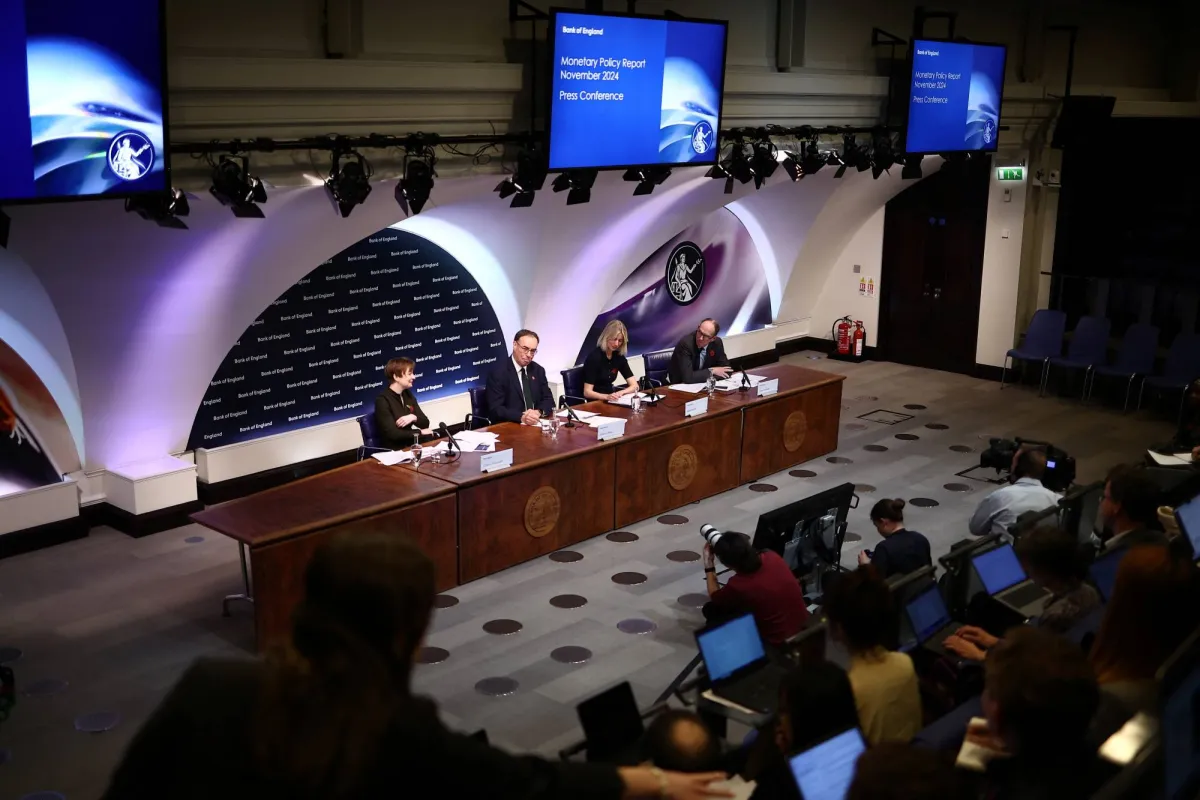 Bank of England Deputy Governor for Monetary Policy Clare Lombardelli, Bank of England Governor Andrew Bailey, The Bank of England's Head of Media and Stakeholder Engagement Katie Martin and Deputy Governor, Markets and Banking, Dave Ramsden hold the central bank's Monetary Policy Report press conference at the Bank of England, in London, on November 7, 2024. HENRY NICHOLLS/Pool via REUTERS