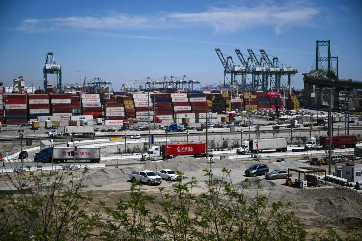 Trucks drive to unload cargo shipping containers as cranes and the Vincent Thomas Bridge stand on the horizon at the Port of Los Angeles in San Pedro, California on April 10, 2025. (Photo by Patrick T. Fallon / AFP)