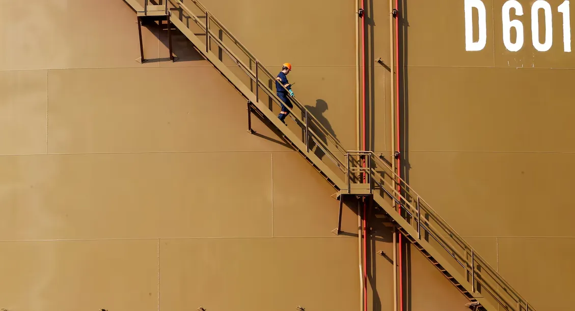 A worker walks down the stairs of an oil tank at Türkiye Mediterranean port of Ceyhan, which is run by state-owned Petroleum Pipeline Corporation (BOTAS), some 70 km (43.5 miles) from Adana February 19, 2014. REUTERS/Umit Bektas/File Photo