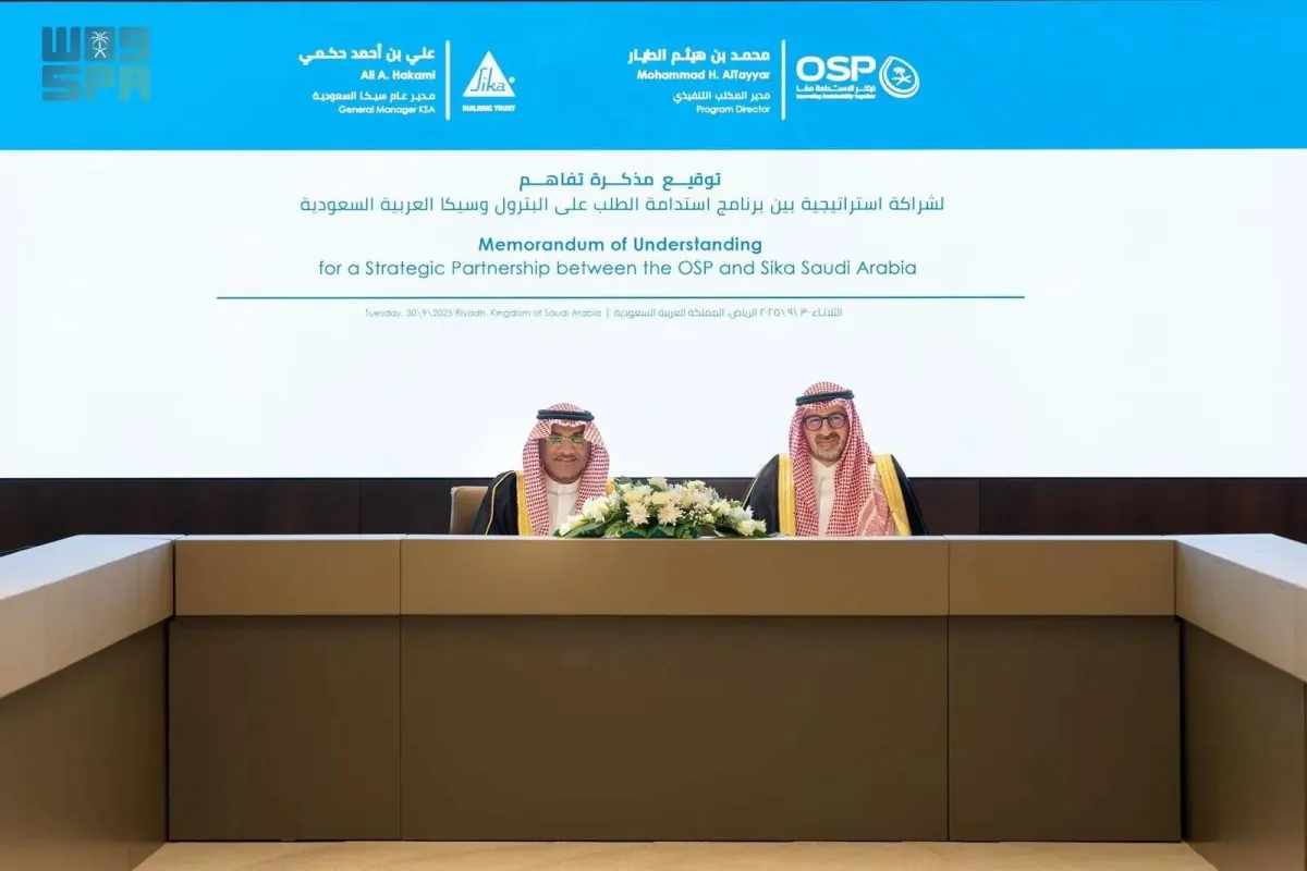 The Oil Sustainability Program (OSP) and Sika Saudi Arabia signed on Tuesday a strategic memorandum of understanding to support innovation in the construction and industrial sectors and strengthen environmental and economic sustainability throughout Saudi Arabia, reported the Saudi Press Agency.