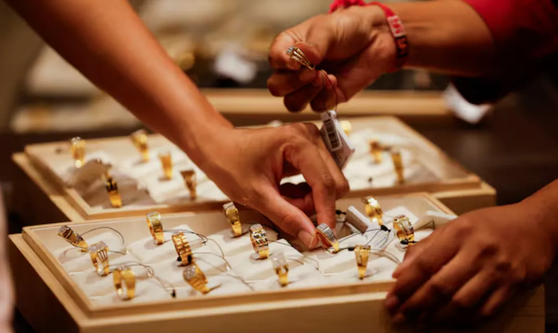 A salesperson shows a gold ring to customers at a jewellery showroom in Ahmedabad, India, October 8, 2025. REUTERS/Amit Dave
