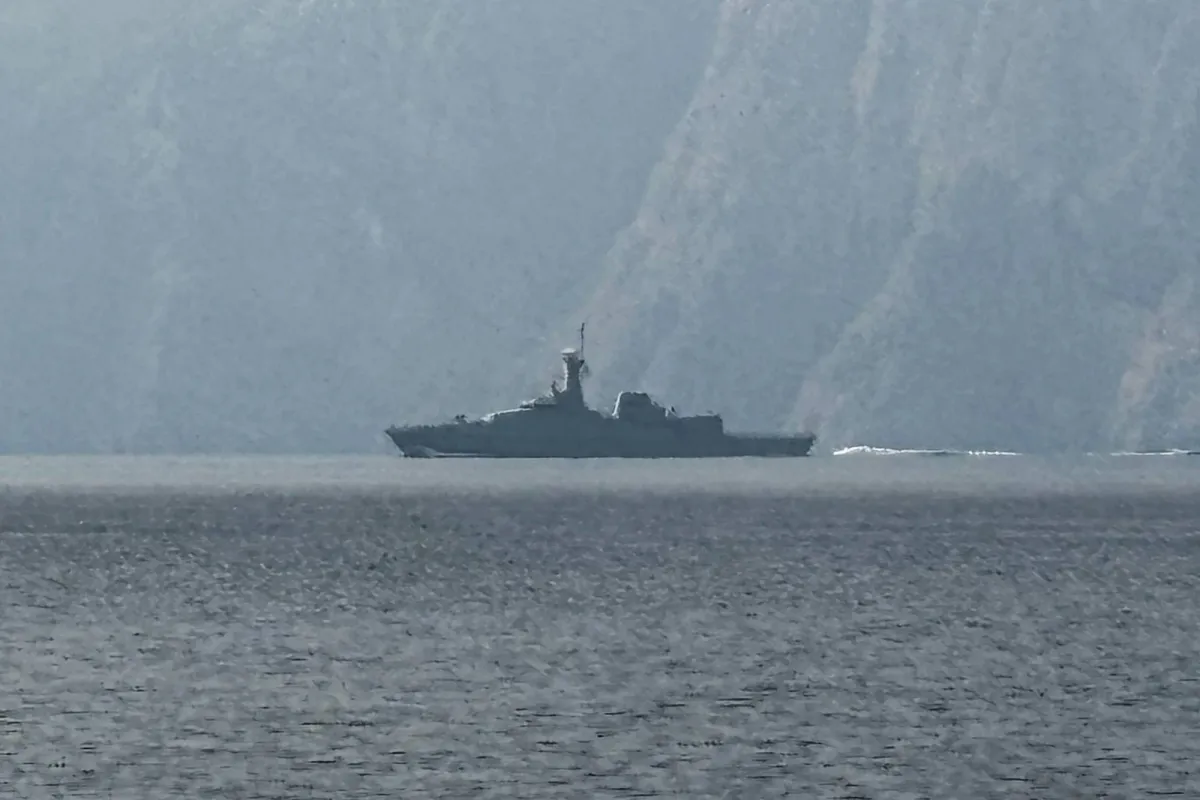 A navy vessel is seen sailing in the Strait of Hormuz, a vital waterway through which much of the world's oil and gas passes on March 1, 2026. (Photo by Sahar AL ATTAR / AFP)