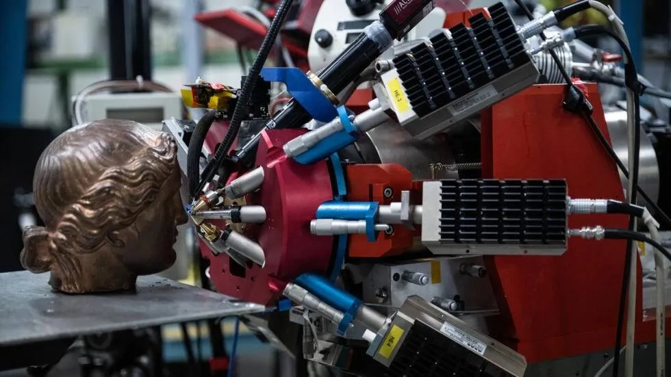 A bronze statue is tested with the center particle accelerator. JULIEN DE ROSA / AFP