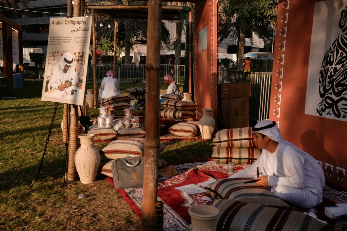 A person uses markers while working on calligraphy, as people take part in a celebration for UAE National Day festivities in Dubai, United Arab Emirates, November 29, 2024. REUTERS/Nabila Eltigi