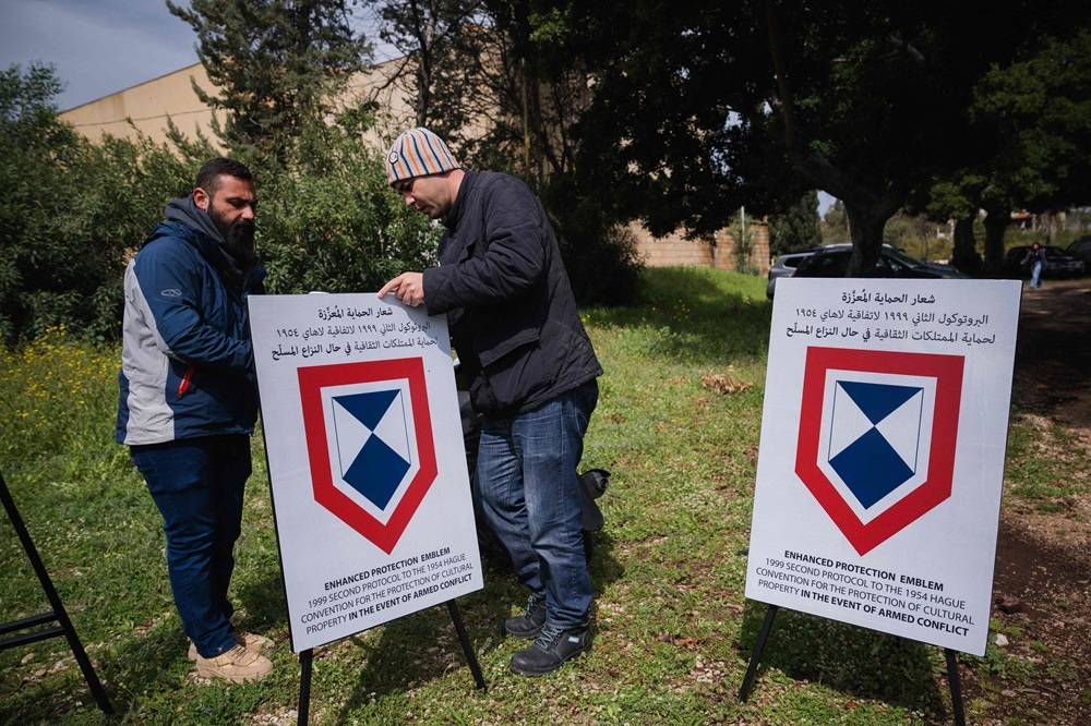 At an archaeological site in southern Lebanon's Tyre, small signs bearing a blue and white emblem provide a symbolic shield, meant to protect the ancient ruins from bombardment.