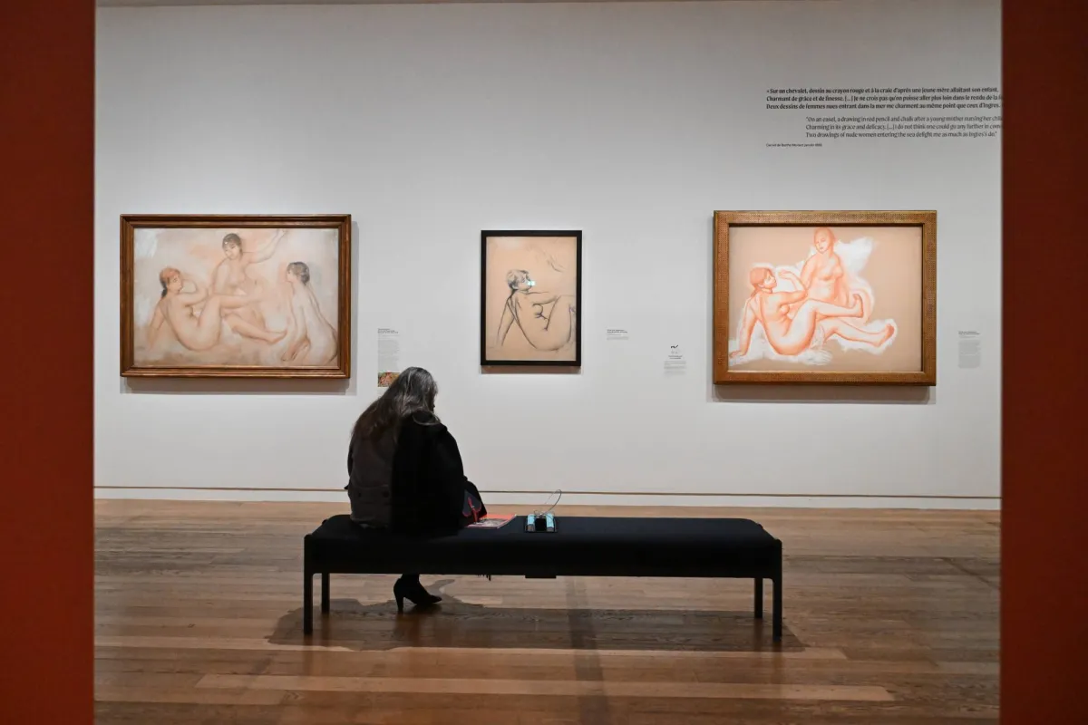 A visitor looks at works by Auguste Renoir during the press review of the exhibition 'Renoir the draughtsman at 'the Orsay museum, Monday, March 16, 2026, in Paris, France. (AP Photo/Emma Da Silva)