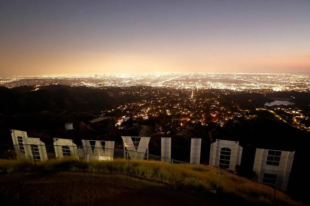 The Hollywood sign stands at dusk on day 106 of the SAG-AFTRA strike against the Hollywood studios on October 27, 2023 in Los Angeles, California. (Getty Images via AFP)