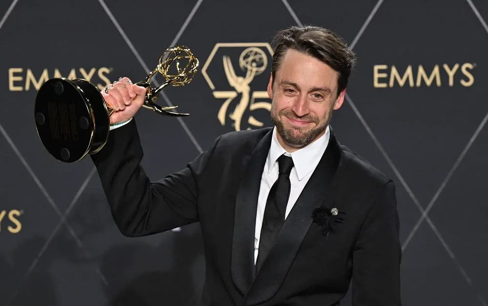 US actor Kieran Culkin poses in the press room with the award for Outstanding Lead Actor In A Drama Series for "Succession" during the 75th Emmy Awards at the Peacock Theater at L.A. Live in Los Angeles on January 15, 2024. (AFP)