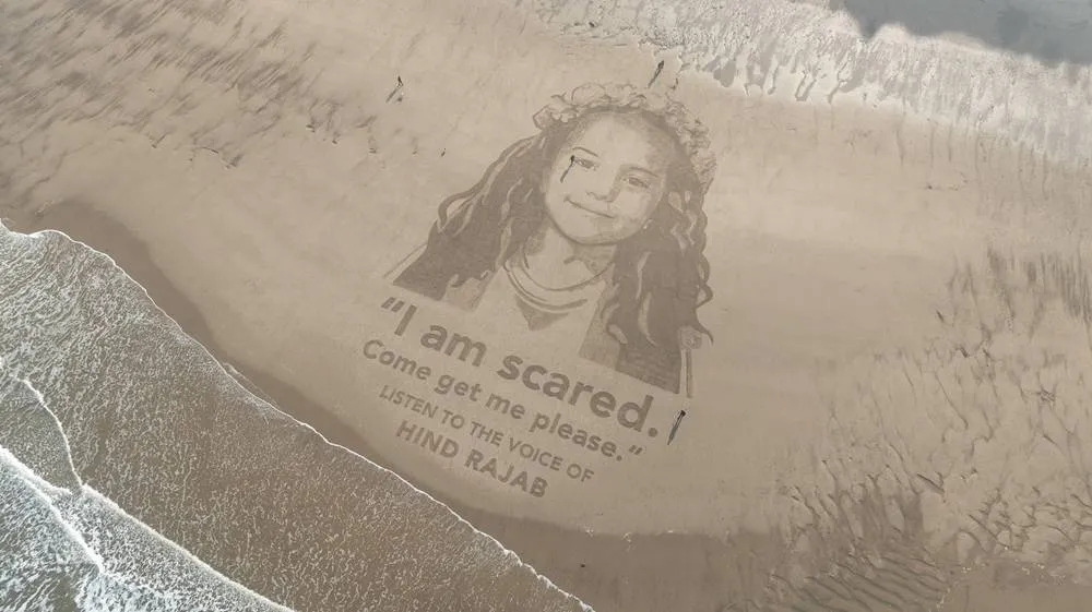 Drone view of a giant sand portrait of Hind Rajab, a 5-year-old Palestinian girl killed in Gaza in 2024 and the focus of the Oscar-nominated film "The Voice of Hind Rajab," created on a beach near Scarborough, North Yorkshire, Britain, in this undated handout image. (A Letter from Lucy/Handout via Reuters)