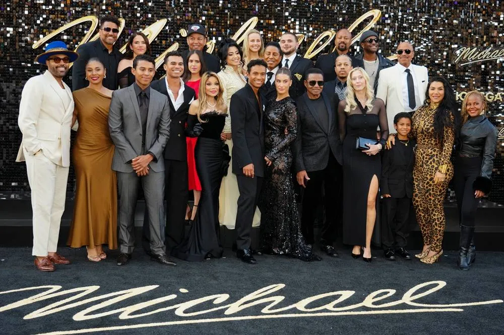 Genevieve Jackson Huguely, from left, TJ Jackson, Jermajesty Jackson, Frances Jackson, Randall Jackson Jr, Tarianno "Taj" Jackson, La Toya Jackson, Jaafar Jackson, Molly Schirmang, Jermaine Jackson, Maddie Simpson, Prince Jackson, Jackie Jackson, Jaimy Jackson, Austin Brown, Marlon Jackson, Asa Soltan and Autumn Jackson arrive at the premiere of "Michael" on Monday, April 20, 2026, at the Dolby Theatre in Los Angeles. (AP)