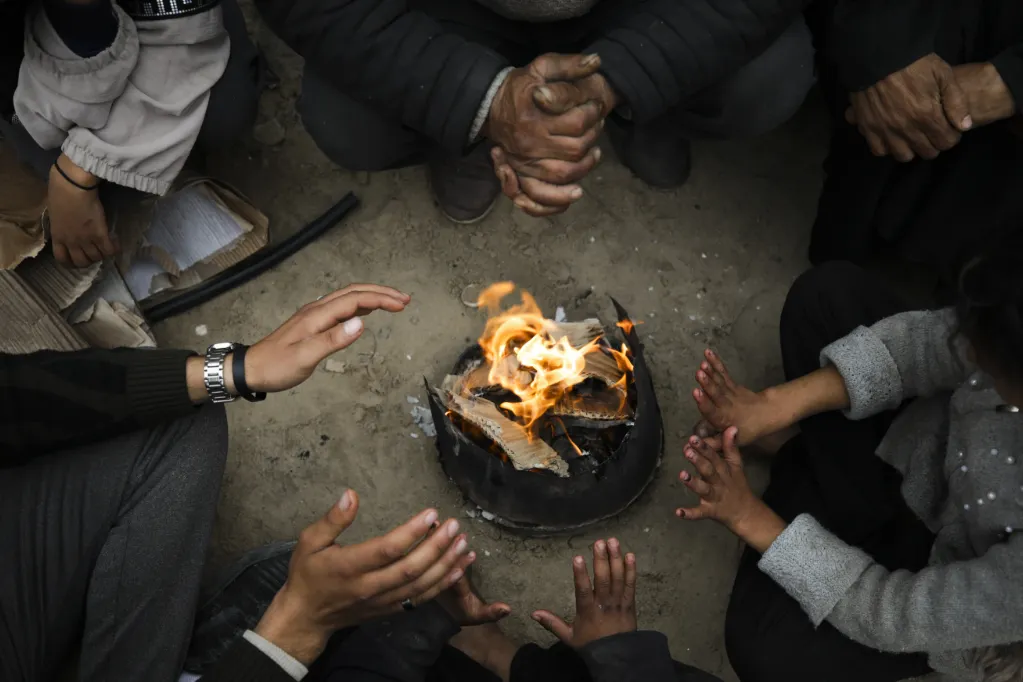 Members of Abed family, warm up by a fire at a tent camp for displaced Palestinians at the Muwasi, Rafah, southern Gaza Strip, Monday, Feb. 24, 2025. (AP Photo/Jehad Alshrafi)