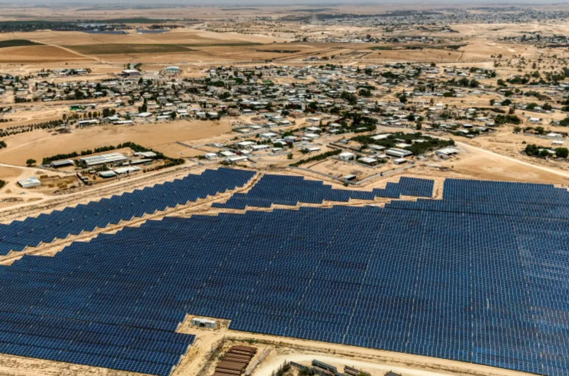 At the end of a dusty road in southern Israel, beyond a Bedouin village of unfinished houses and the shiny dome of a mosque, a field of solar panels gleams in the hot desert sun.
